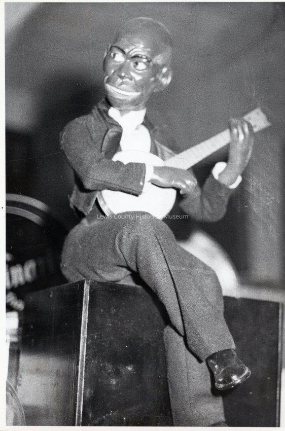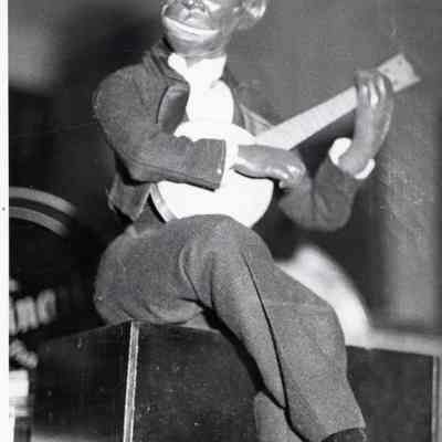 Photo of a coin-operated banjo strumming black man. It was made around 1918-1925. Good photo of toy. See related photos P9053 to P9057.
