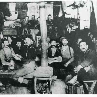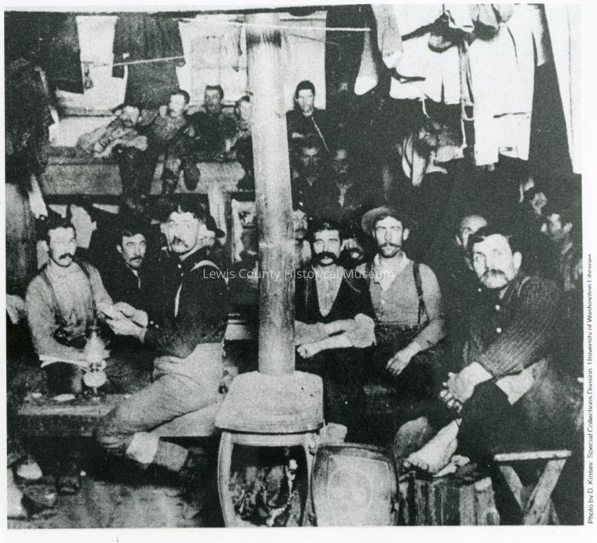 Typical bunkhouse scene in logging camp in Lewis County, ca. 1890-1920. Note heavy socks, underwear and rain clothes hanging on wall and lines. No ID on men or place.Collection