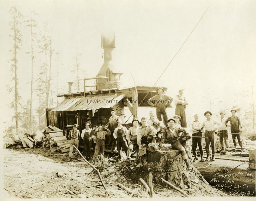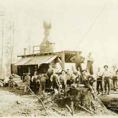 Camp 7, Record Side of National Lumber Co. near Independence, ca. 1920's. Victor Smith is 3rd man from right in this 18 man crew near the steam donkey engine.