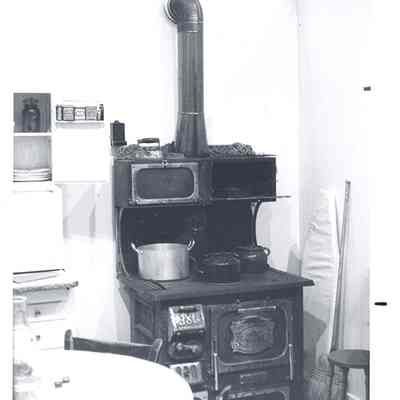 LCHM exhibit showing kitchen equipment, Kitchen Queen, Majestic wood stove, ironing board, table and chairs and kettles are displayed. Dec. 1979. Have negative.Lexicon