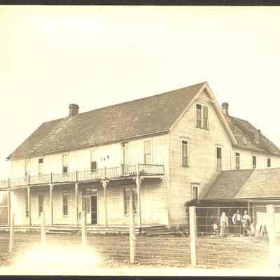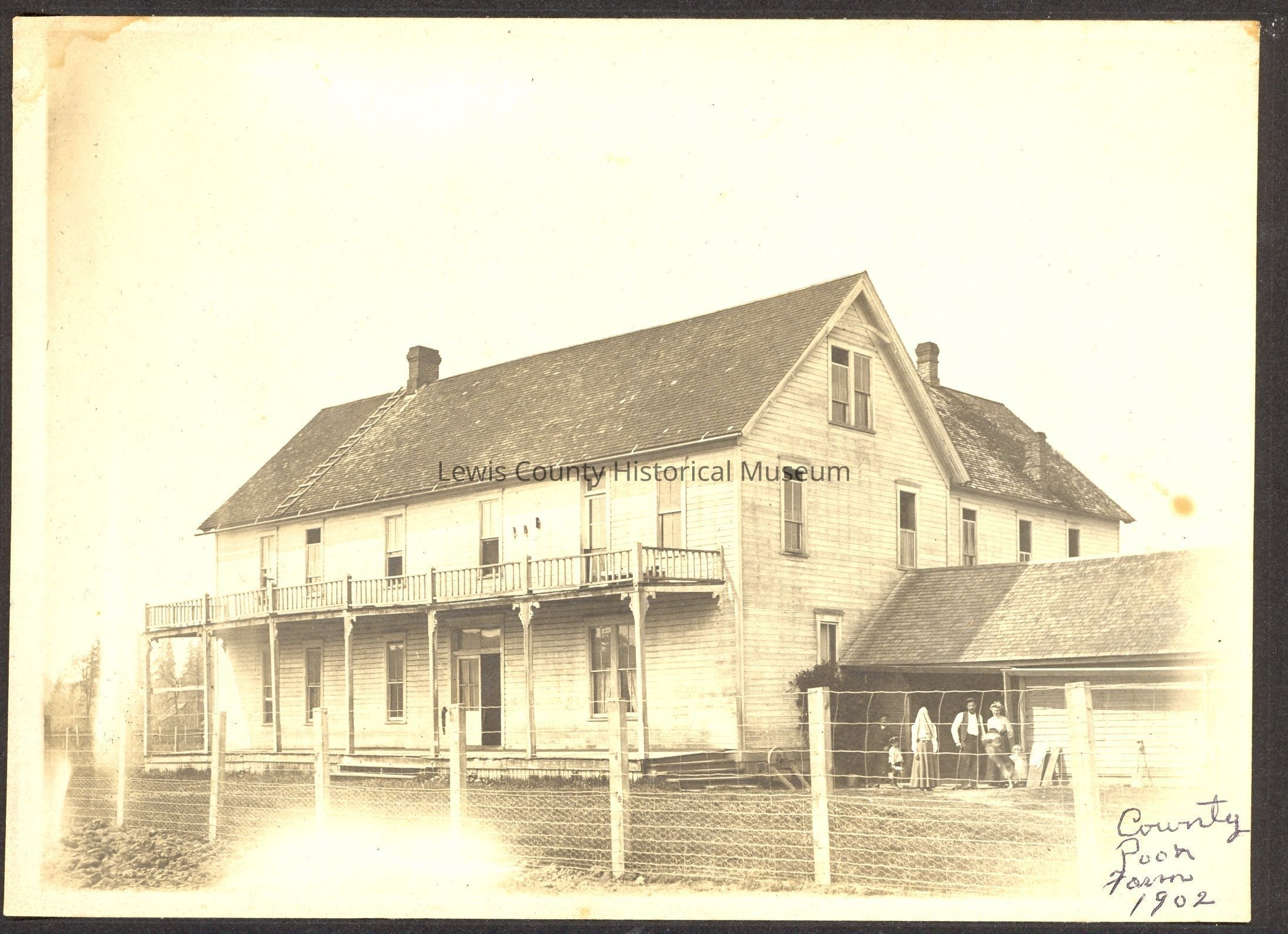 Lewis County Poor Farm, 1902. Two story frame building with large attic, shingle roof. Porch across entire front. Unidentilfied people in yard. Wire fence, Mrs, Dunston (1902) went to work for Mr. Crochett at the farm as a cook. Mr. Crochett got a different job and Mrs. Dunston became operator of the farm. Excellent mounted photo. Have negative.Collection