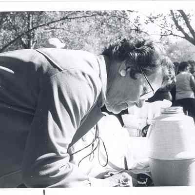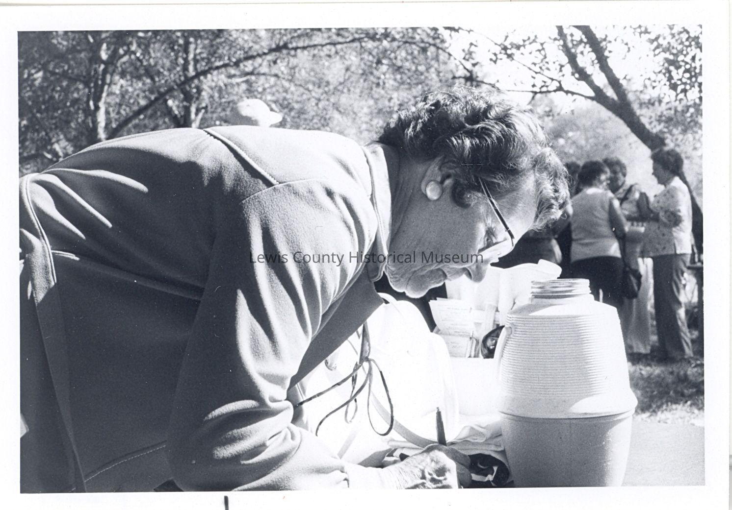 Old Timers North Fork Picnic at the John Kostick farm on the North Fork of the Neuwaukum River, WA. L to R: Priscilla Teeter Johnson, Others unidentified. August 1979. Have negative.Lexicon