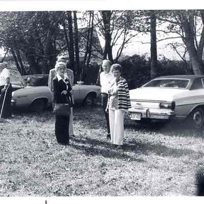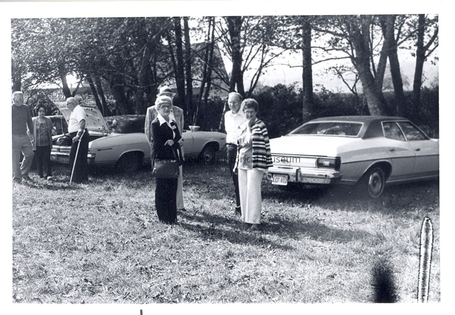 Old Timers North Fork Picnic at John Kosticks farm on the North Fork of the Neuwaukum River, WA. L to R: ____, ____, Vernon Pagel, Mary Bennett, Jennings Bennett, Don & Myrtle Bunker.Aug 1979. Have negative.Lexicon