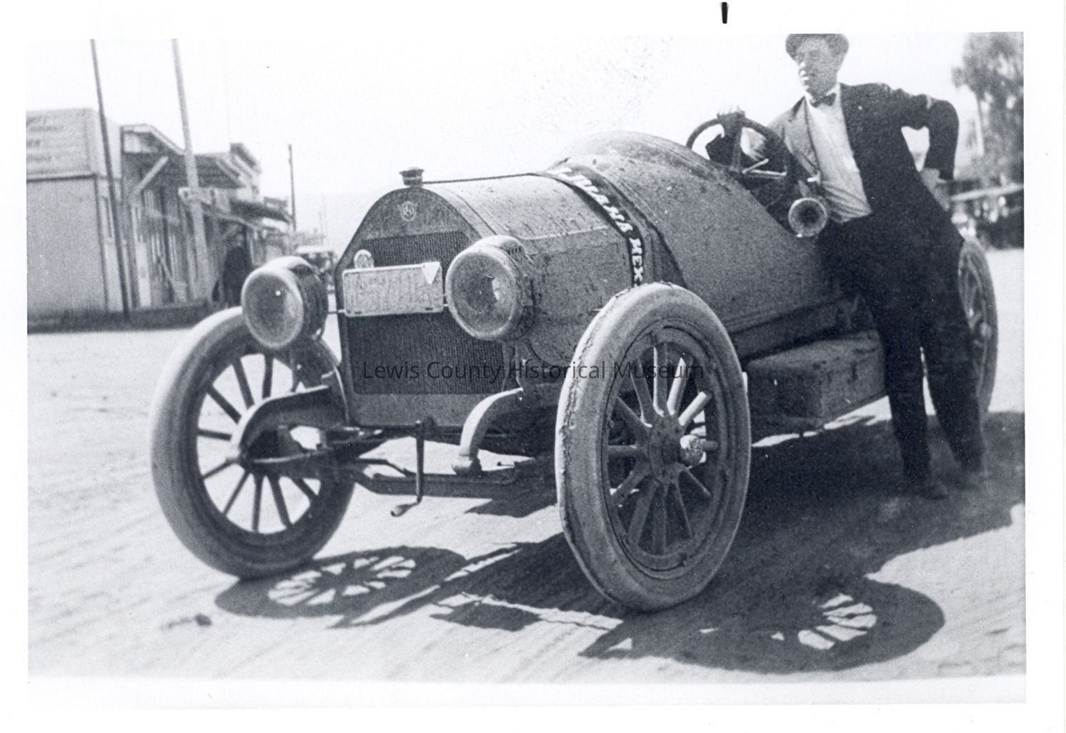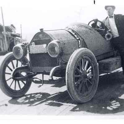 Ernie Kuehner and his automobile "Bug" on a 3 week trip to Los Angeles, CA. The car had to be shipped back on a boat because the trip was too rugged. Ernie Kuehner beside the car. Circa 1916. Return trip is #P3482 Have negative.Lexicon