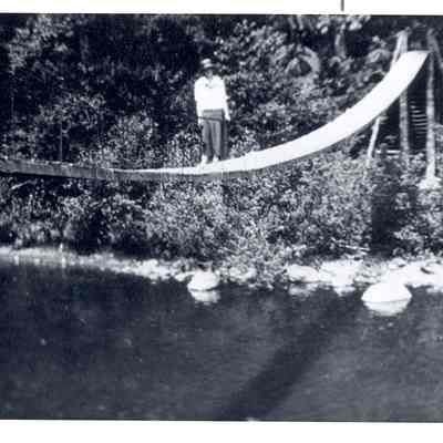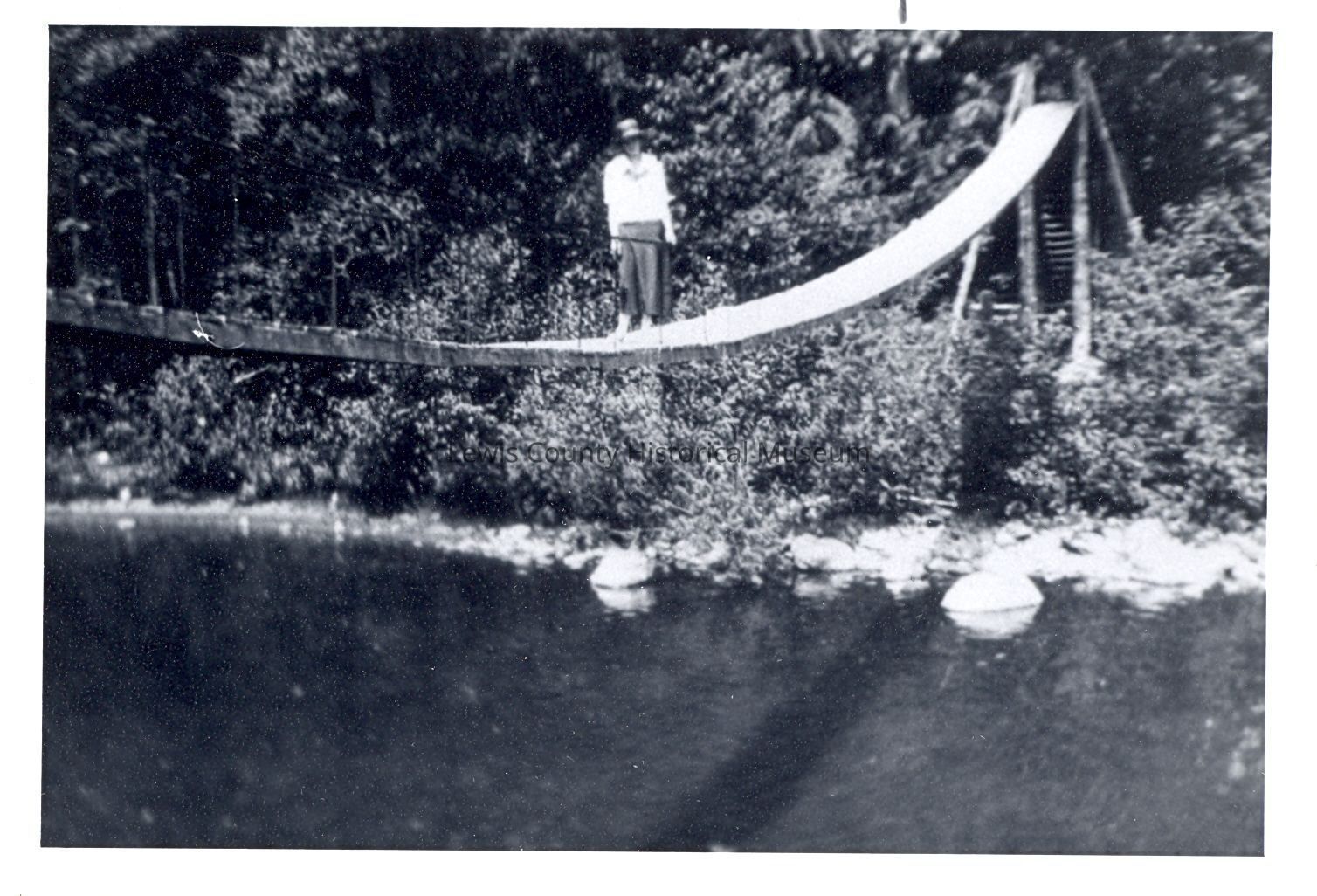 Hattie Stedham standing on a swinging bridge across the Tilton Bridge at Morton, WA. Circa 1917. Have negative.Collection