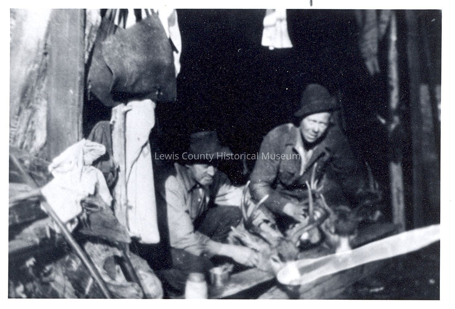 Dr,. Paul and Clarence Justad in camp during Cispus, East Canyon hunting trip. Shows inside of lean-to and deer heads, (they got 14 deer this trip), circa 1916. Rifles and gear show to the left of photo. Have negative.Collection