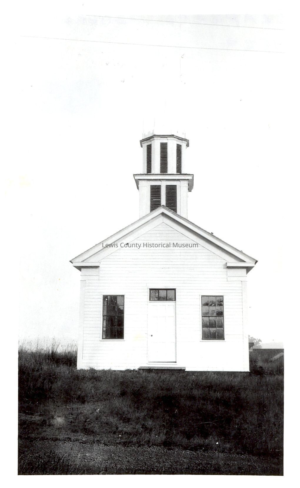Photo of exterior of the Claquato Church after restoration in 1929. The new Crown of Thorns, belfry slats all replaced, window glass replaced, foundation rebuilt, new roof installed and the building repainted. The money collected (approximately $500.00) paid for the reconstruction in full, it all came out even according to Mr. A.C. (Act) Conlee, secretary and treasurer. Have slide.Collection