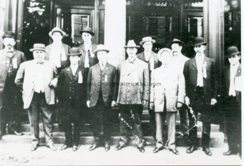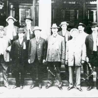 Group of members of the Liederkrantz in front of the Chehalis City Hall, Chehalis, WA, (not much of the building showing). Have negative.