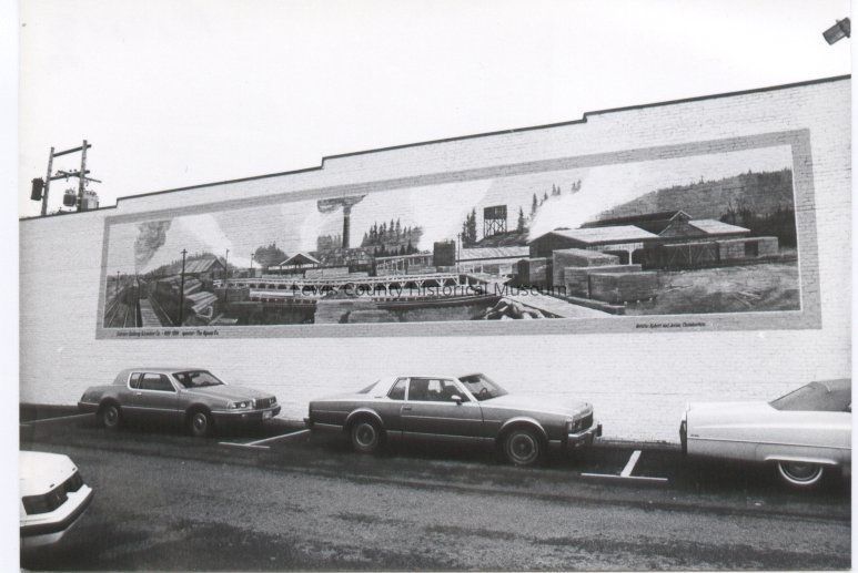 Mural: "Eastern Railway and Lumber Co, 1910-1939" 60 feet long on north side of Central Automotive Supply on North Pearl St., Centralia, Wa., done in fall of 1986. Photo ca. 1987. 3 1/2x5, black and white print, 04.13.Cataloged By