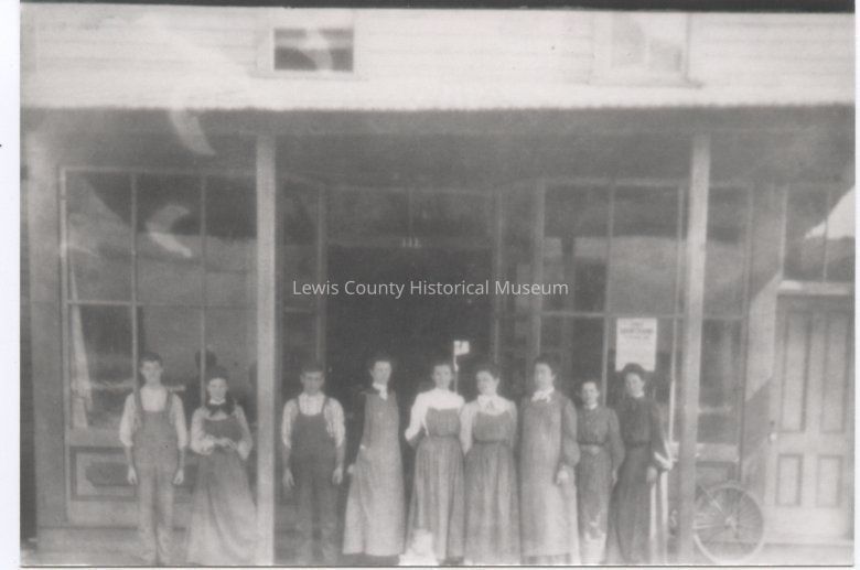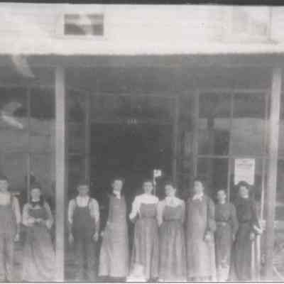 Churchill Glove Factory, Centralia, employees pose outside factory to have picture taken ca. 1900-10, 3 1/2x5, black and white print, 04.13.Cataloged By