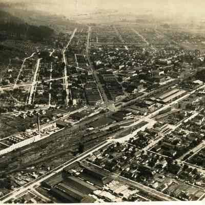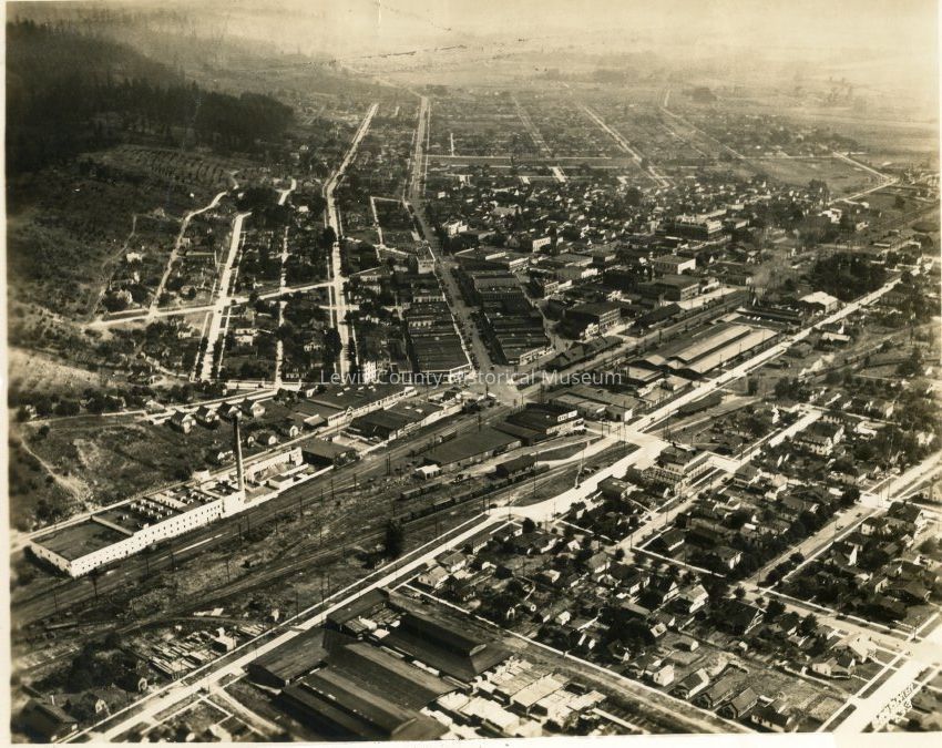 Aerial photo of Chehalis, WA, looking south, hill east of Chehalis is on left of photo, Market Street runs vertically from center to top. West side of Chehalis is in right corner of picture. Borden plant with tall stack is along National Avenue. ca 1927Collection