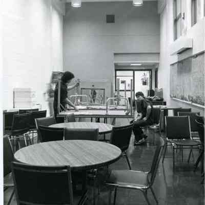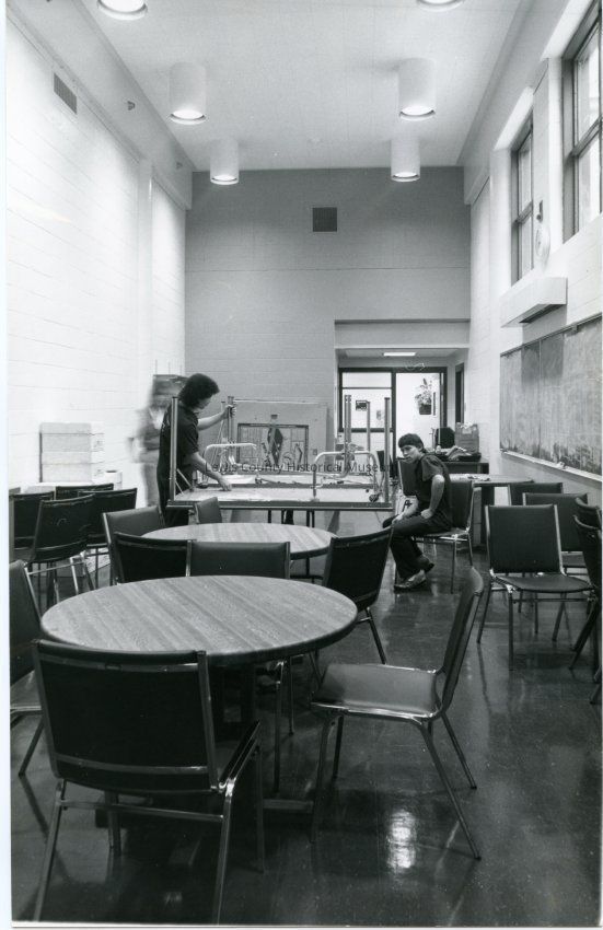 Recreation area at the new Lewis County Jail, Chehalis, WA, 1986 before it was opened. shows game tables and a couple trustees getting things set up for the opening. Have negative.Collection