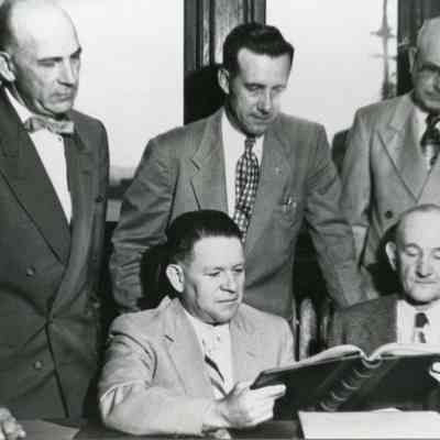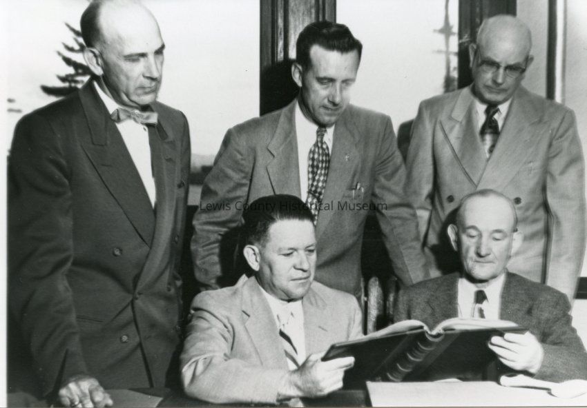 Chehalis City Commisioners, 06/21/1962. L-R: Leonard Souveman, Louis Pemerl, Fred Linn, seated Mayor Walter Graham and Commissioner Fred Moore. Have negative.