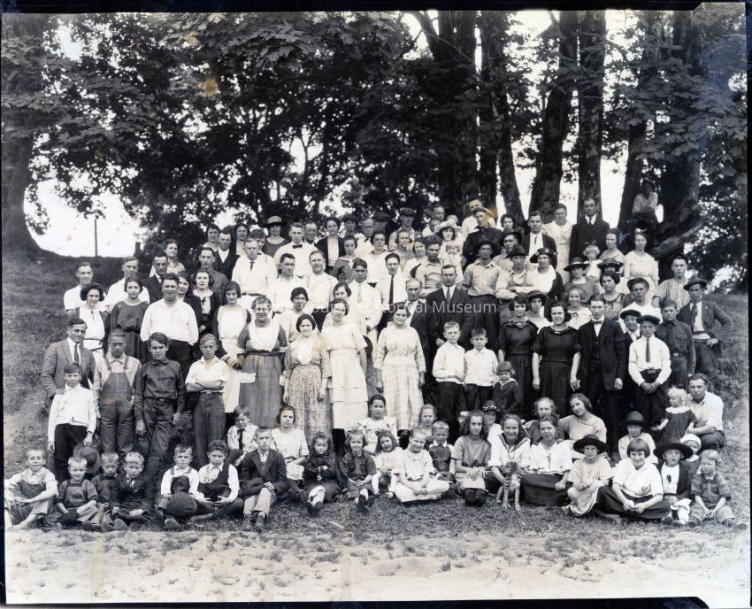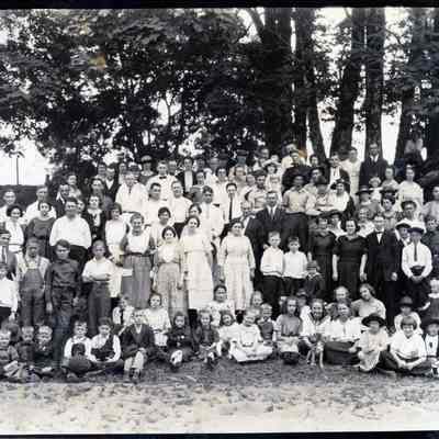 Carnation Plant picnic ca. 1920. No ID except extreme left, 4 rows back from front is Alta Jeffries and behind her is Milton E. Jeffries and to his left is Louie Wisner.Collection