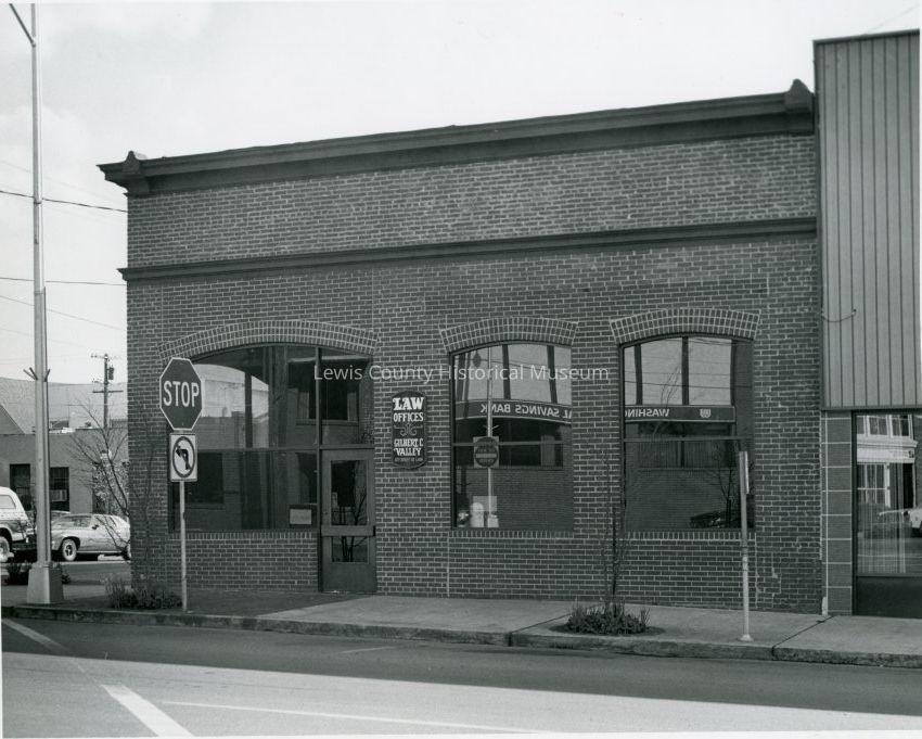 Attorney Gilbert C. Valley's Law Office, SW corner of Pacific and Park in Chehalis, WA. Phot ca. 1974 during time he practiced 3 or 4 years in Chehalis.Collection