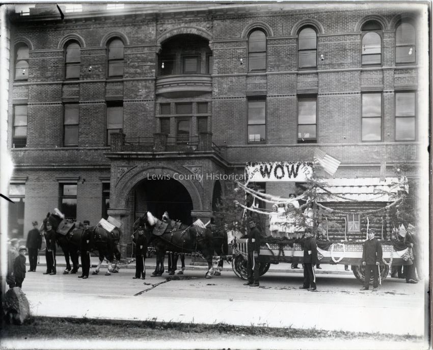 Photo of the Chehalis Courthouse,(Eliza Barrett' block), built in 1891. In front is a horse drawn float with uniformed men around the float. A sign over the girls standing on the float reads: WOW Camp 192. Have negative.