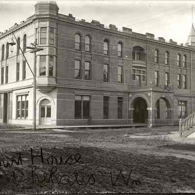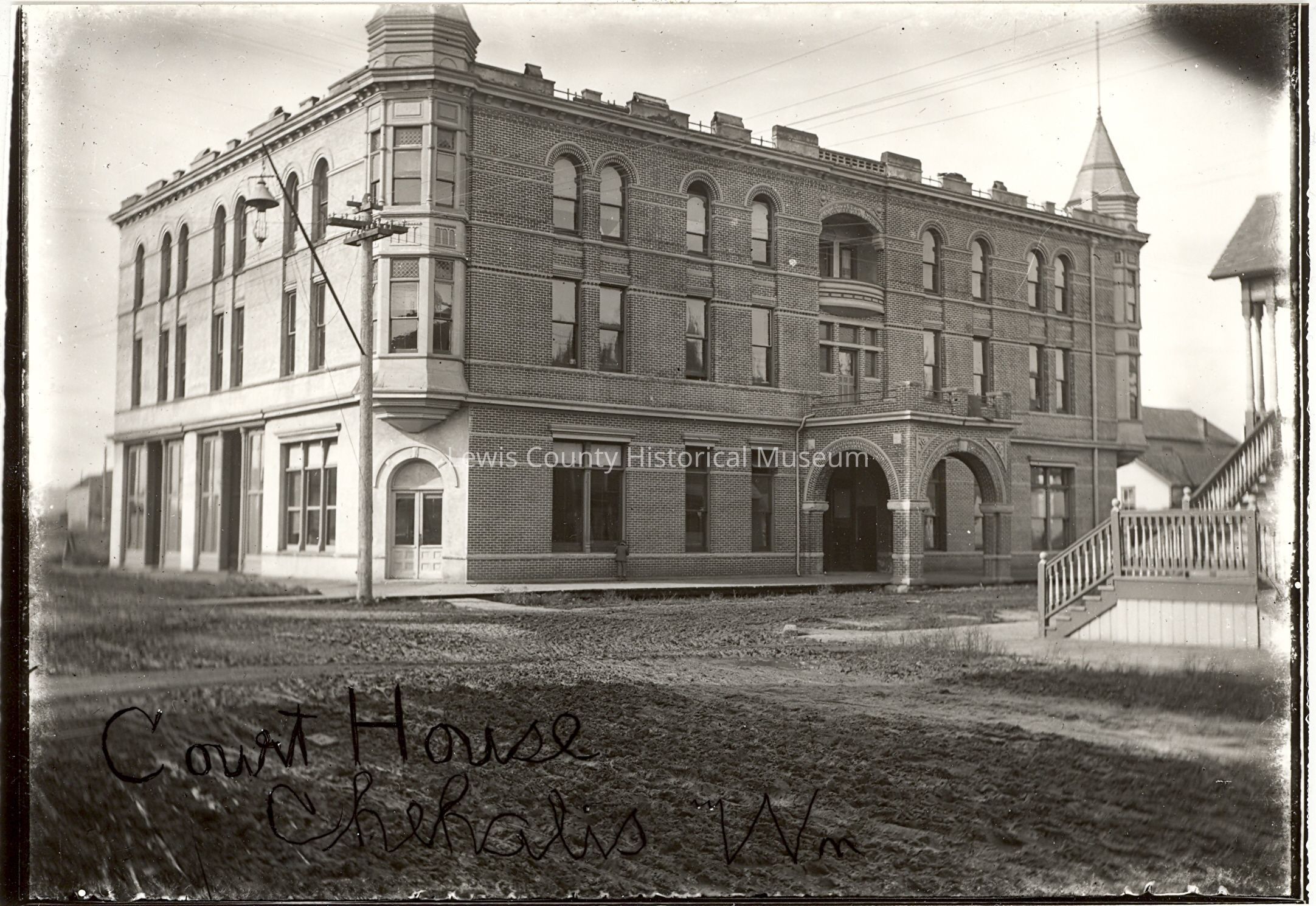 Photo of Courthouse, Chehalis, WA, dirt street, plank sidewalk, telephone poles with glass insulators, electric lights.Made/Created