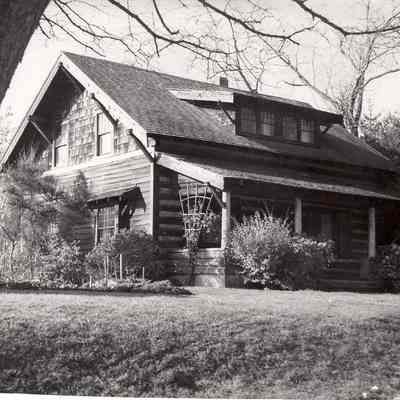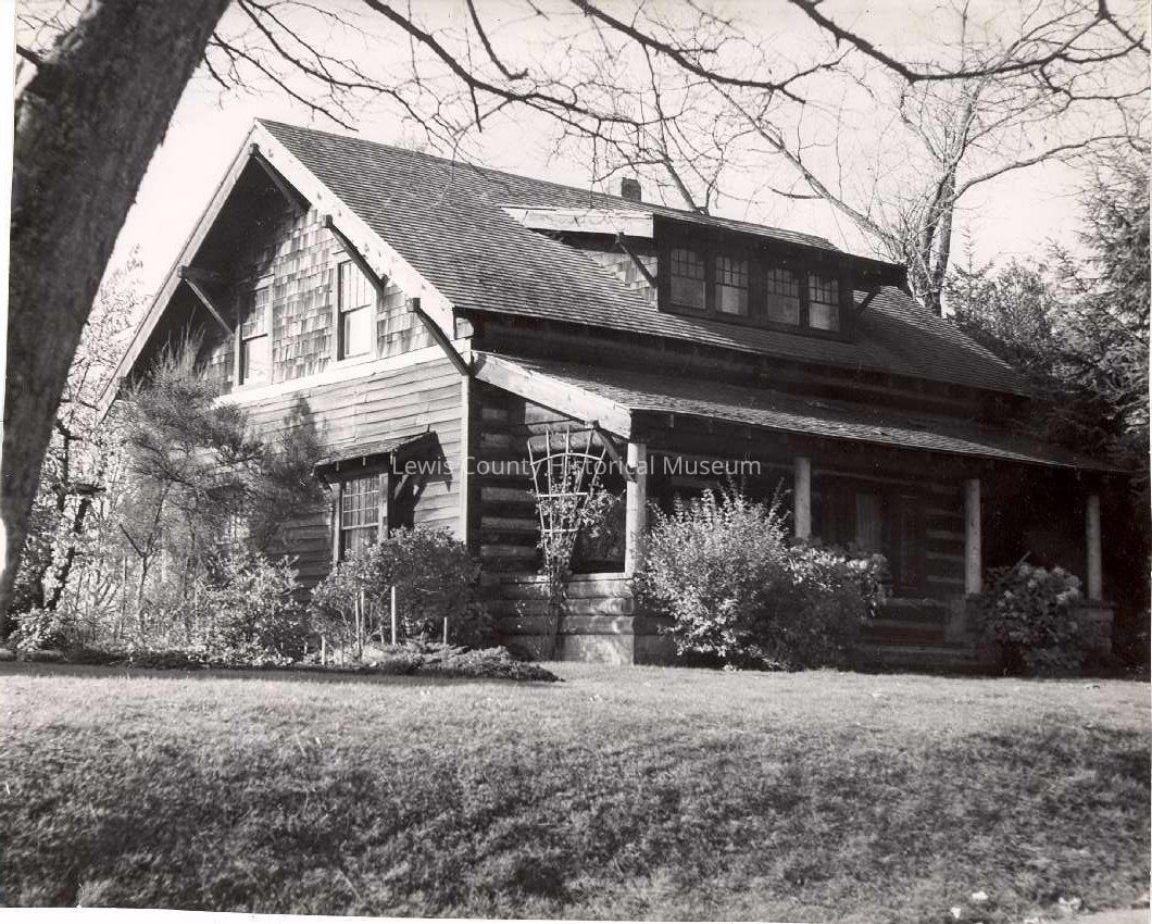The Obadiah B. McFadden home built in 1859 on Chehalis Ave. in Chehalis, WA. It is a split cedar and chinked log house,1 1/2 story. Logs cut from the hillside east of its location. Several ornamental bushes are planted around the front porch and lawn. Have negative.Collection