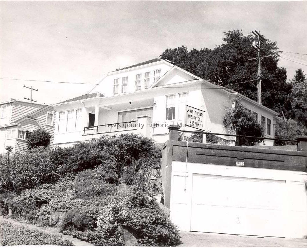 Lewis County Historical Museum, former Arthur Cory home on Washington Ave. Chehalis,WA. The house is a two story frame and stucco. Large front porch between two wings of the house, plate glass window and iron pipe railing. House is on a hillside with garage at street level. Front yard has shrubery and plants. Have negative.