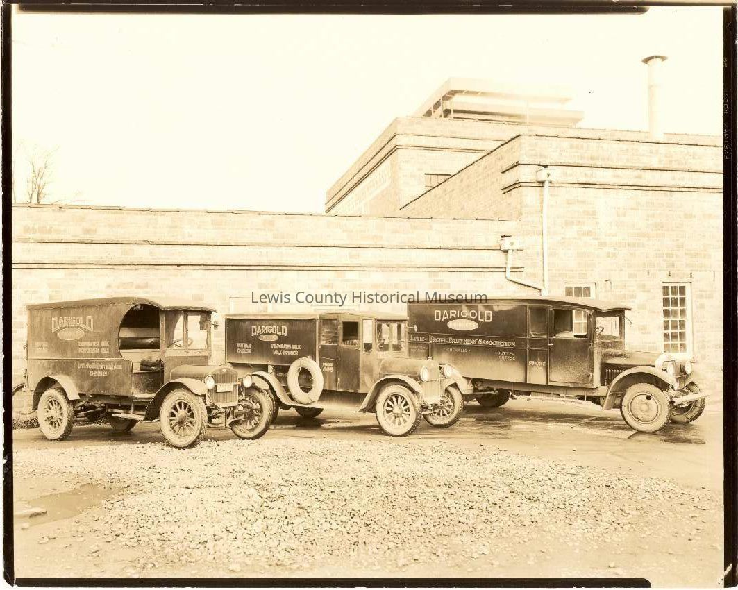 Darigold milk delilvery truck, Lewis County Dairy Association. Shows the Darigold brick building in the background, It has 3 delivery trucks in front. Advertisement reads, "Lewis-Pacific Dairyman's Associlation". Have negative.Lexicon