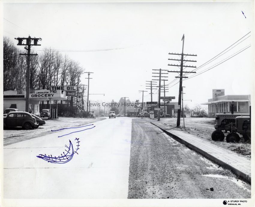 Old Hwy 99, similar to P17005 with Middleton's Time Oil Station on left and Moorehead's Grill on right.Lexicon
