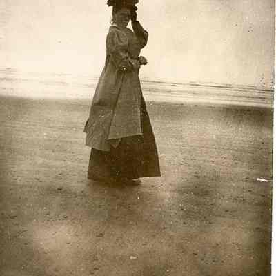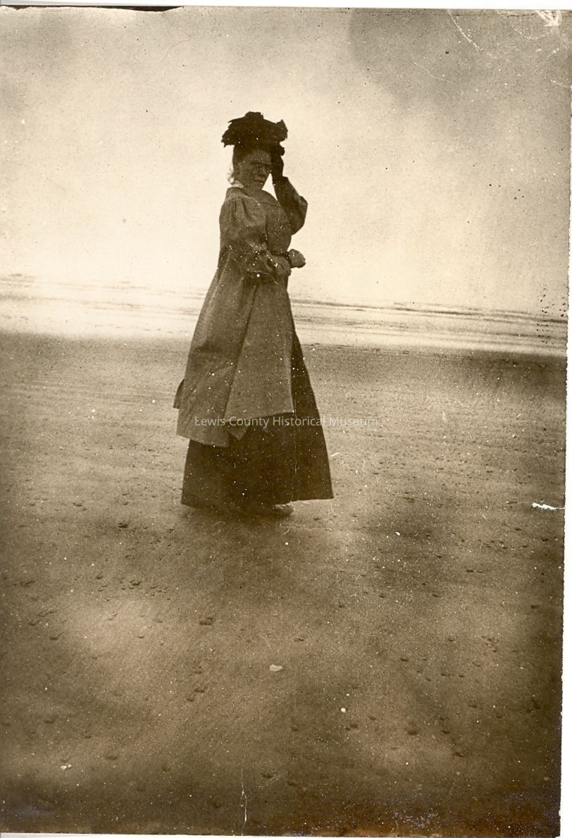 Fashion lady on the beach in full dress, including fancy hat. Photo taken at Moclips, WA in 1907 by Tom Clippinger. Have negative.Collection