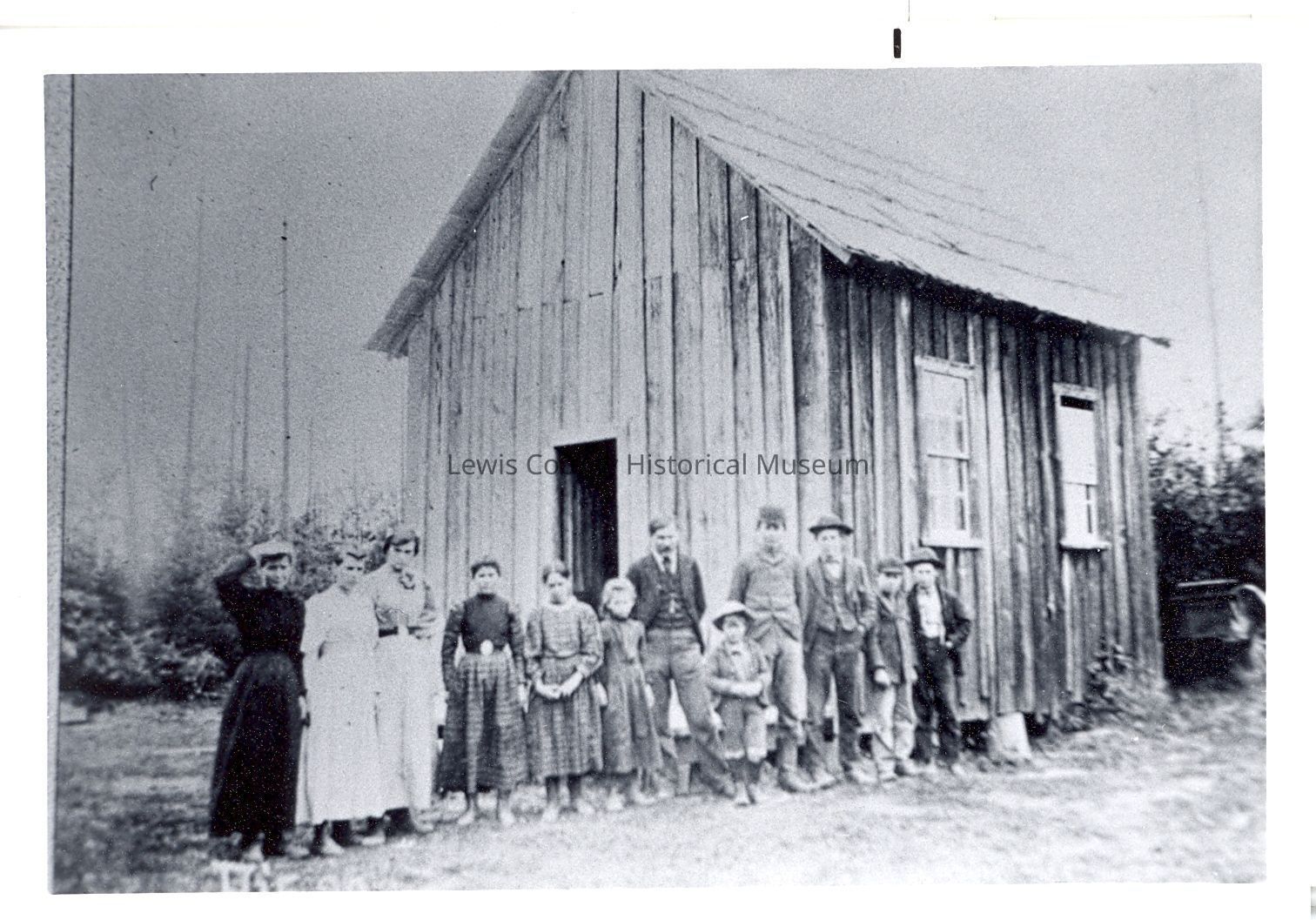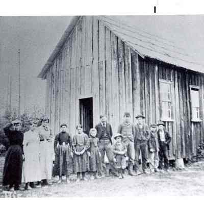 First Knab school house building with students (unidentified) standing in the front . This area is now known as Layton Prairie. Have negative. Have slide.