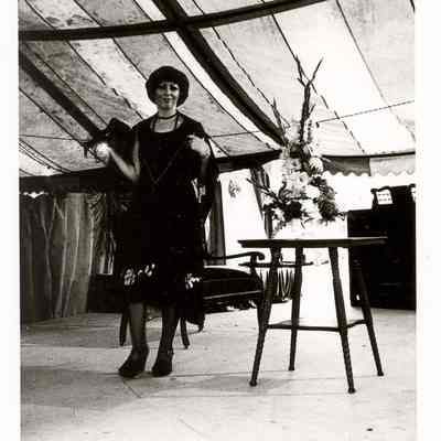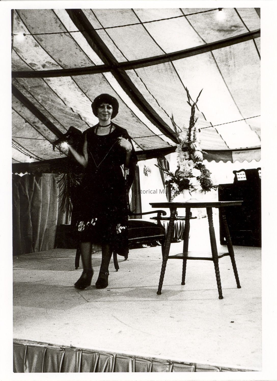 1980 Fashion Thru The Ages style show model Jayla McGill wearing a 1920's black prom dress donated by Barbara Wood. Taken at the SWW Fairgrounds free stage. Have negative.Collection
