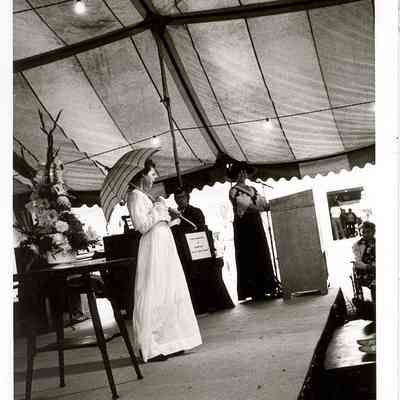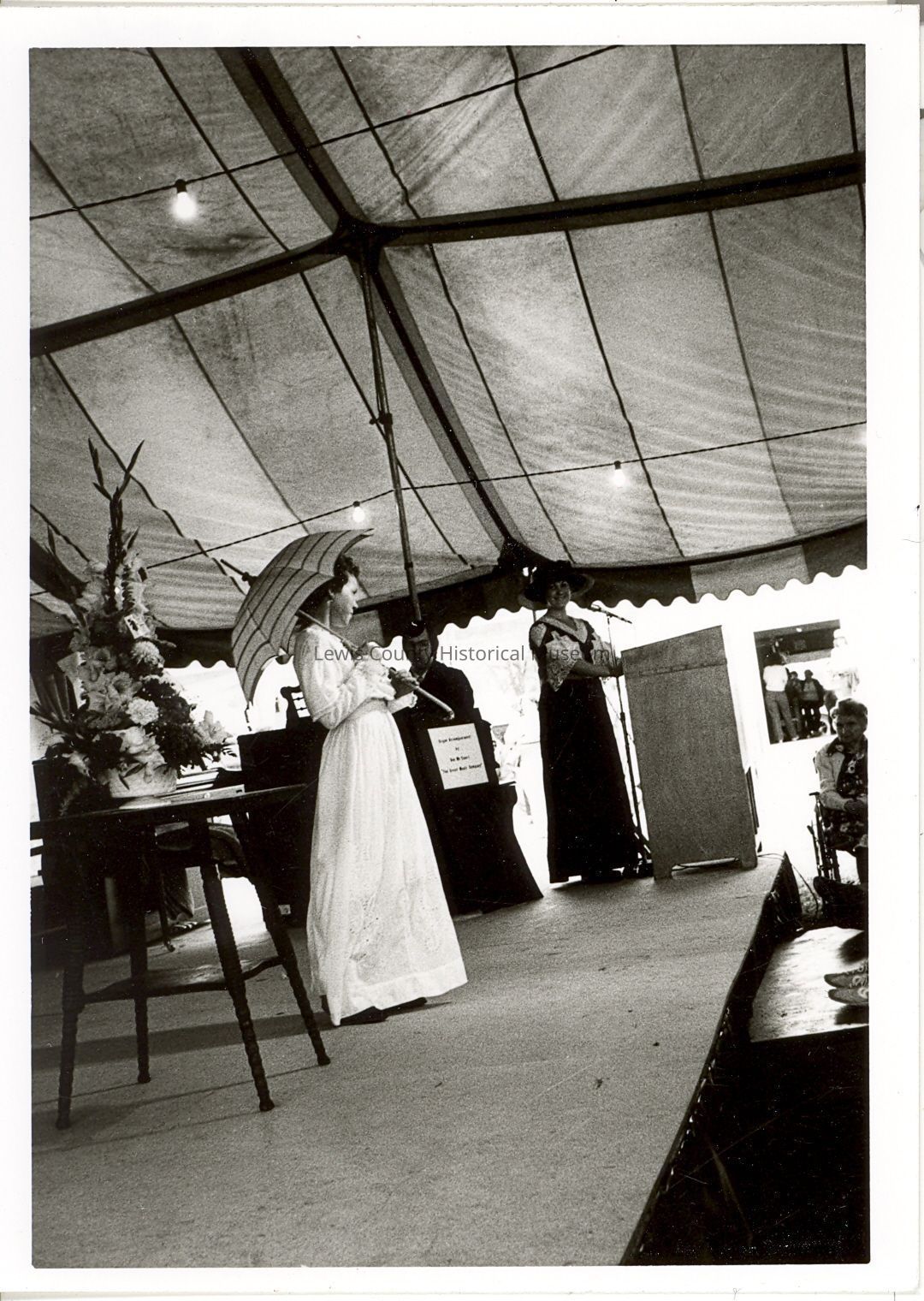 1980 Fashion Thru The Ages style show model Brenda Buckmaster modeling a white day dress from 1890, with a parasol. Taken at the SWW Fairgrounds free stage. Have negative.Collection