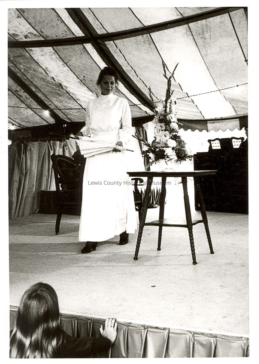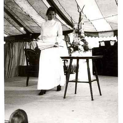 1980 Fashion Thru The Ages Style Show model Debbie Conrad modeling a 1900's white day dress with dropped bosom. Taken at the SWW Fairgrounds free stage. Have negative.Collection