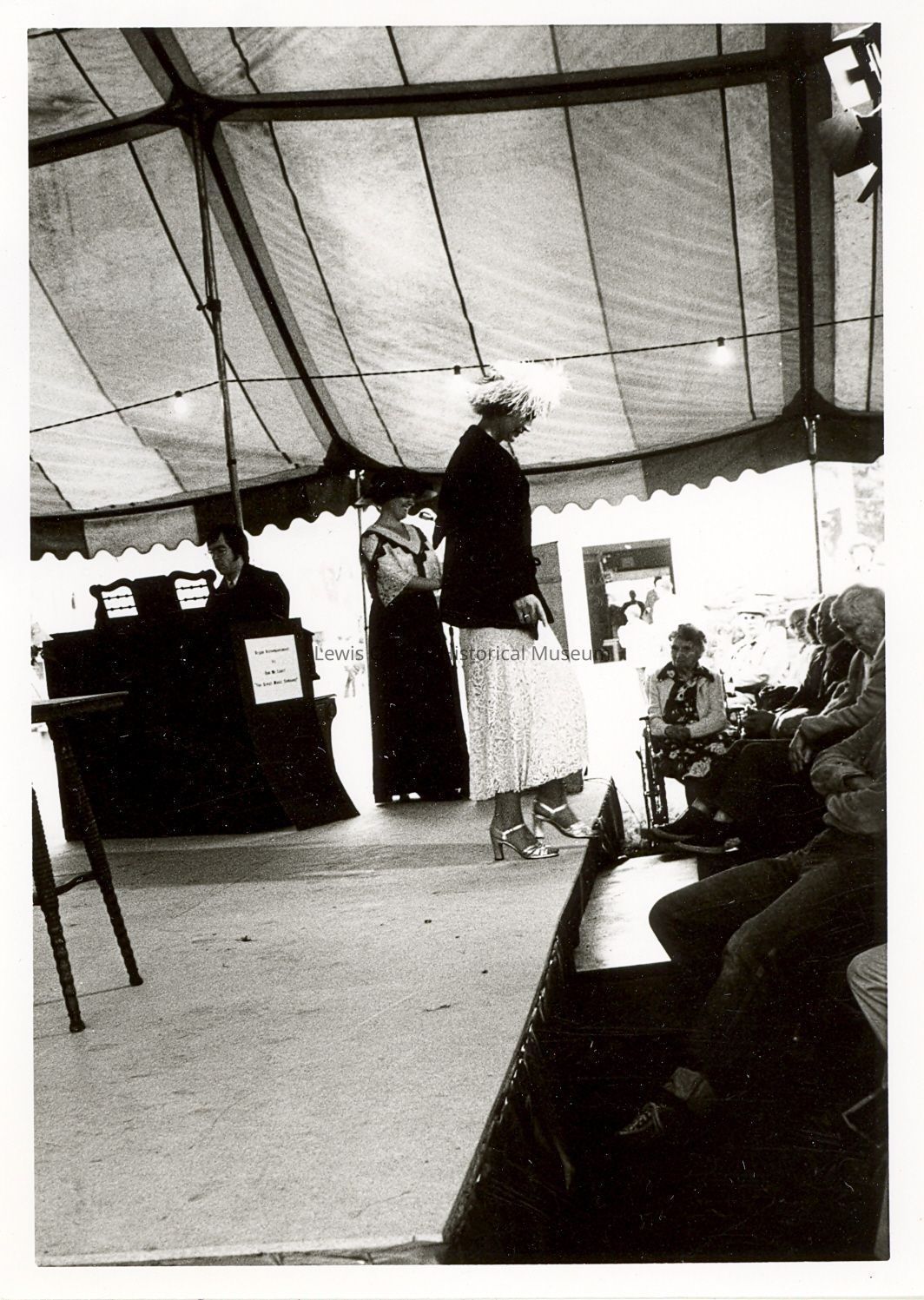 1980 Fashion Thru The Ages Style Show model Sharon Hagstrom wearing a 1930's white brocade dress and brown velvet jacket. Taken at the SWW Fairgrounds free stage. Have negative.Collection
