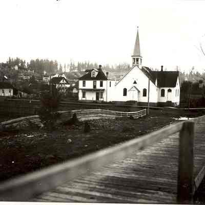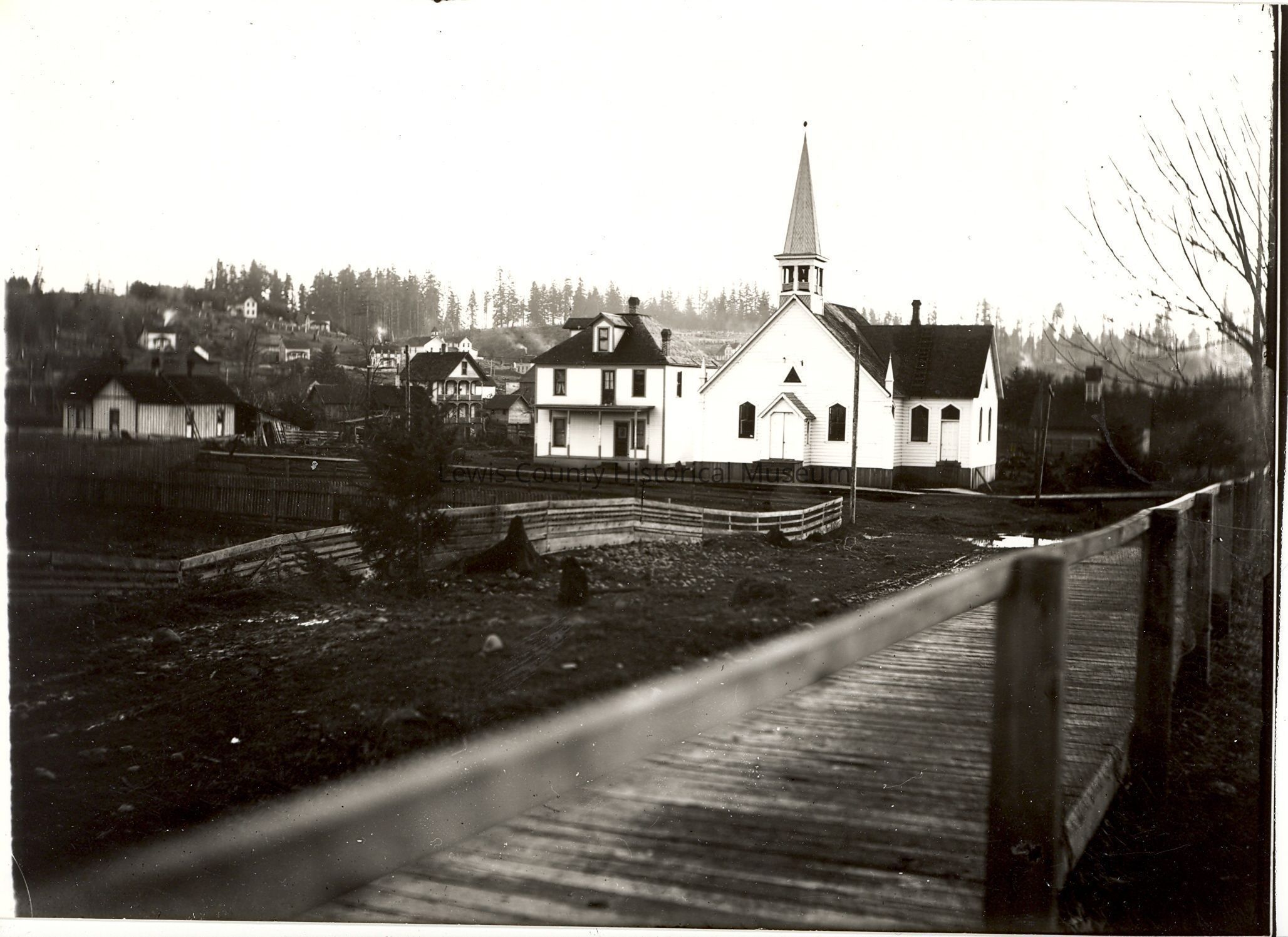 Old Methodist Church in Winlock, WA. Board walk and curbs, dirt road. Numerous houses in background. Church moved several times. Copies from glass negative of Leland Large Have negative.Lexicon
