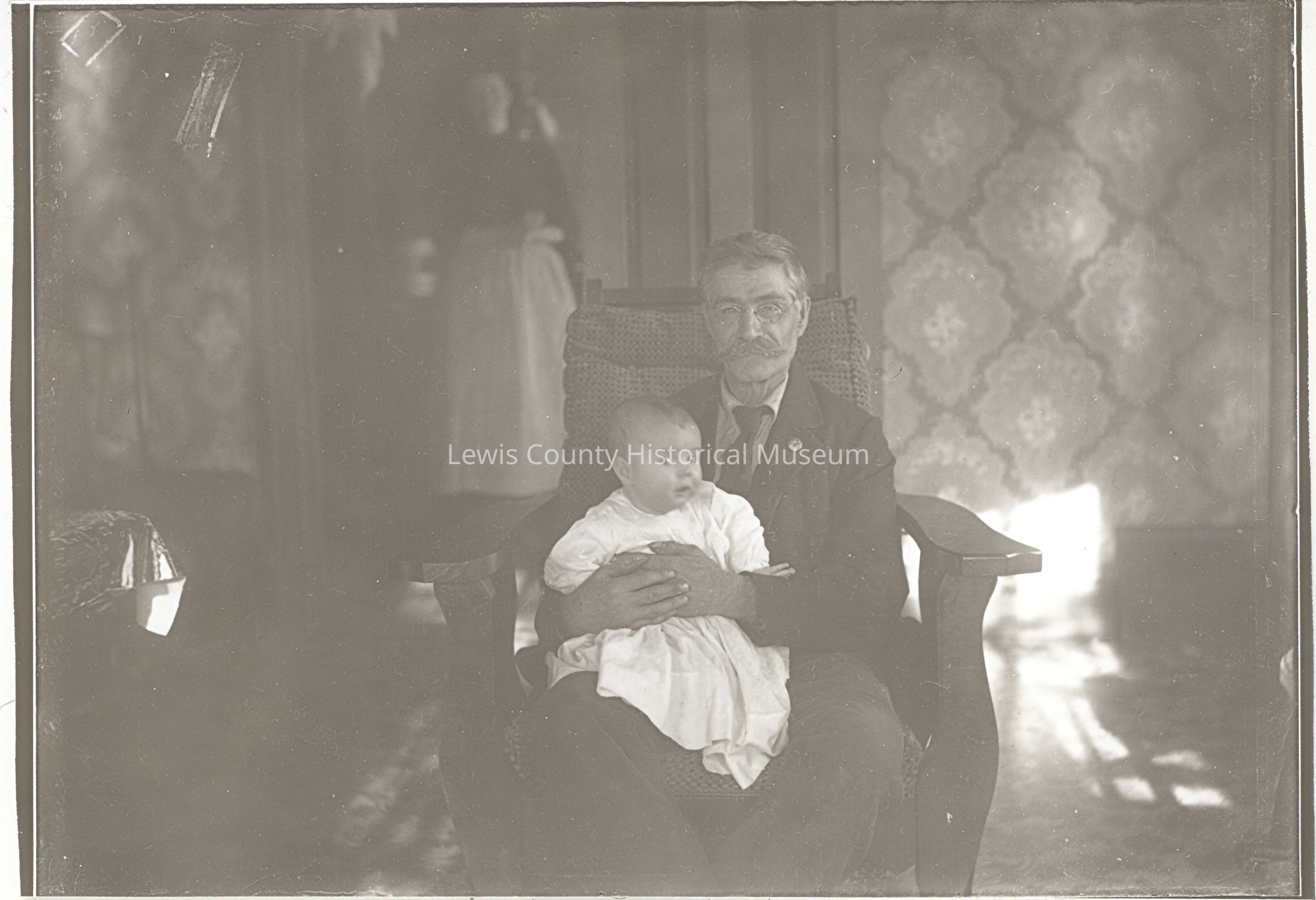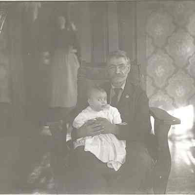 Photo, could be R.D. the first & Leland and an unidentified woman standing in rear. Man holding baby sitting in wooden arm chair, floral design wallpaper, cushioned seat and back chair, light from window on floor.Made/Created