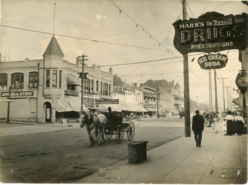 Street scent of Market Street, Chehalis, WA, 1908/1910. Bechaud's Drug Store, White & Gabel Bookstore, Daugherty's Millinery, Staeger's Book & Stationary, St. Helens Hotel on left side. Other side: i s Marr's Drugs, Burnett's Jewelers, clock on sidewalk, Coffman Bank and Merchant's Tailor Shop. Horse & buggy on street and at least two early cars, dirt street; Dr. Parrish, Dentist upstairs in Bechaud's Drug Store.Collection