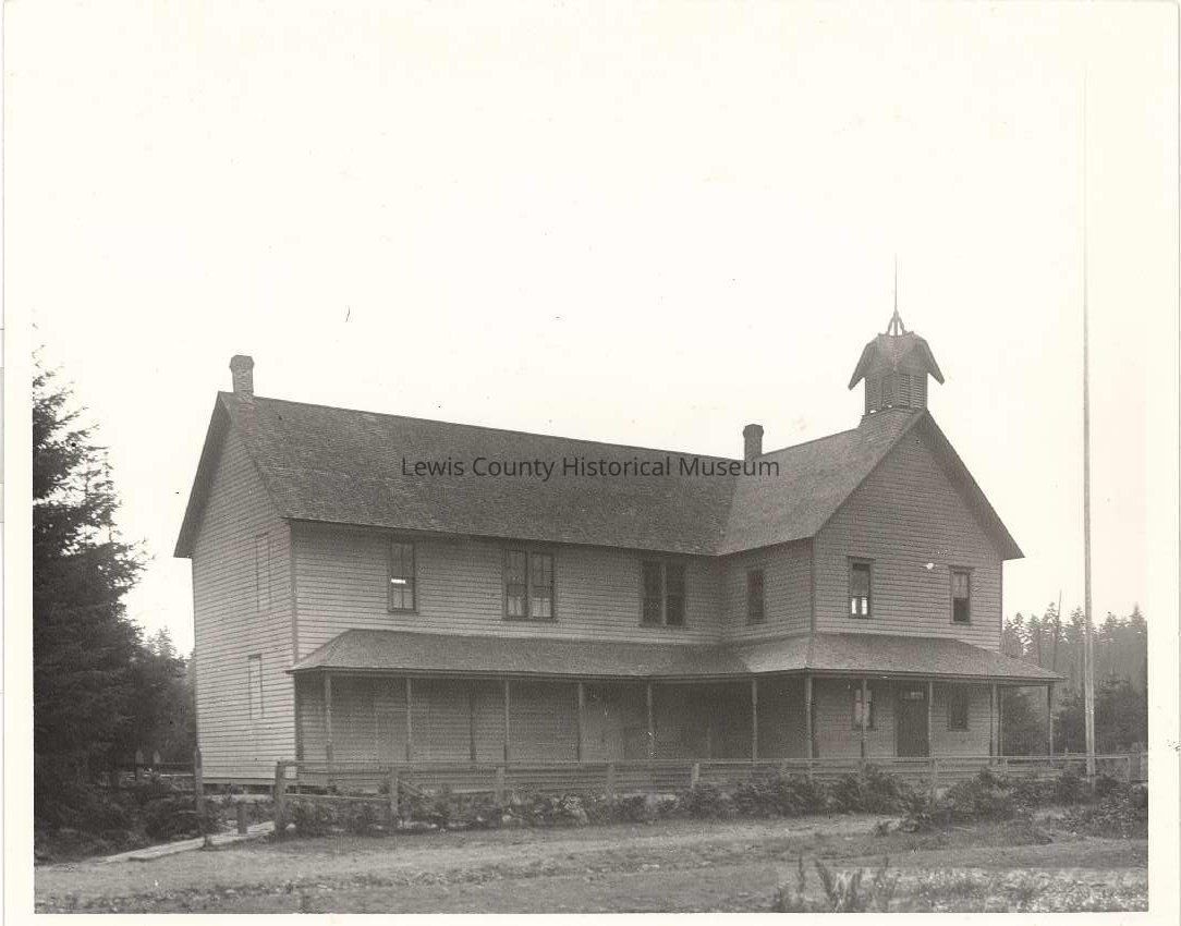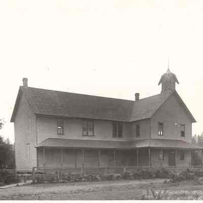 Photo of Napavine School 1911. Exterior frame, two story long porch, steeple, flag pole in front, dirt road. Have negative. Have slide. Glass Negative