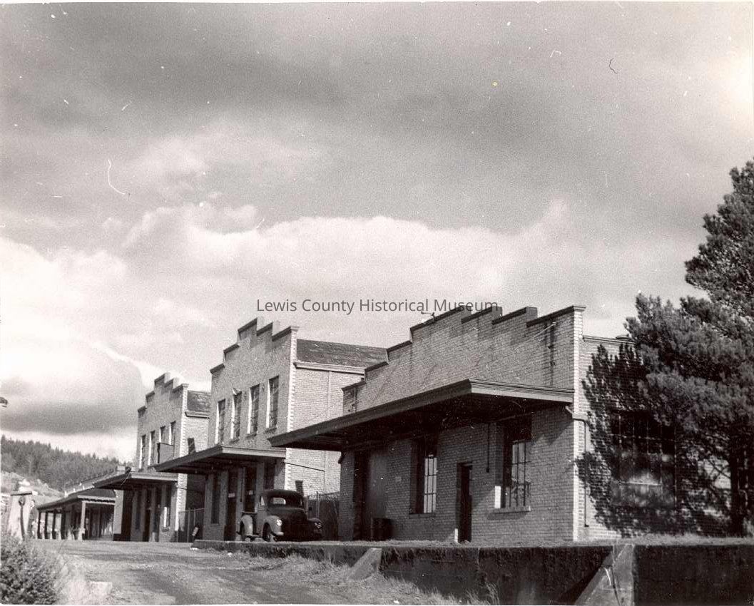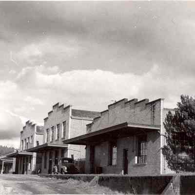 Green Hill shop area. Four brick buildings are shown with an old International truck parked between two of the buildings. Have negative.Collection