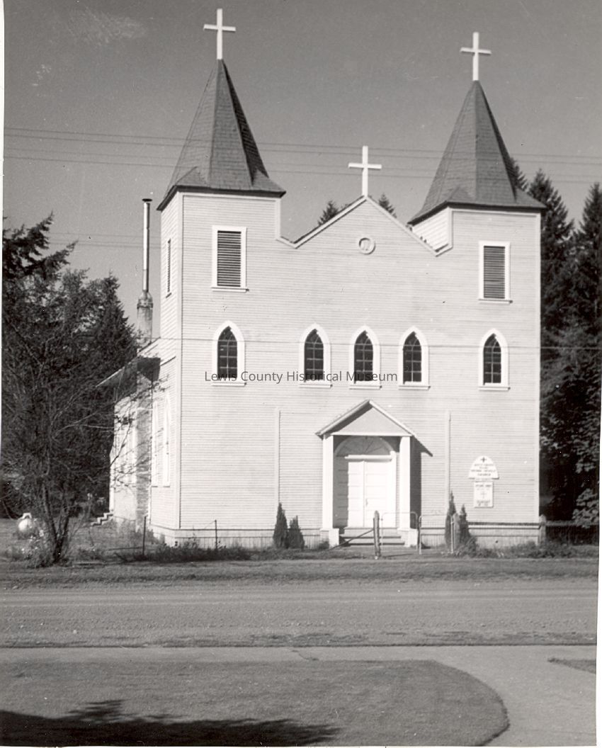 Front view of National Polish Catholic Church, Pe Ell, WA. Built in the early 1900's. Frame buildilng, 2 steps up to double front doors. 5 arched windows above doors. 2 high steeples each with a cross on top. A third cross on the peak between the two steeples. High narrow metal chimney in the rear. The church faces the road. Have negative.Collection