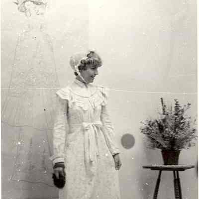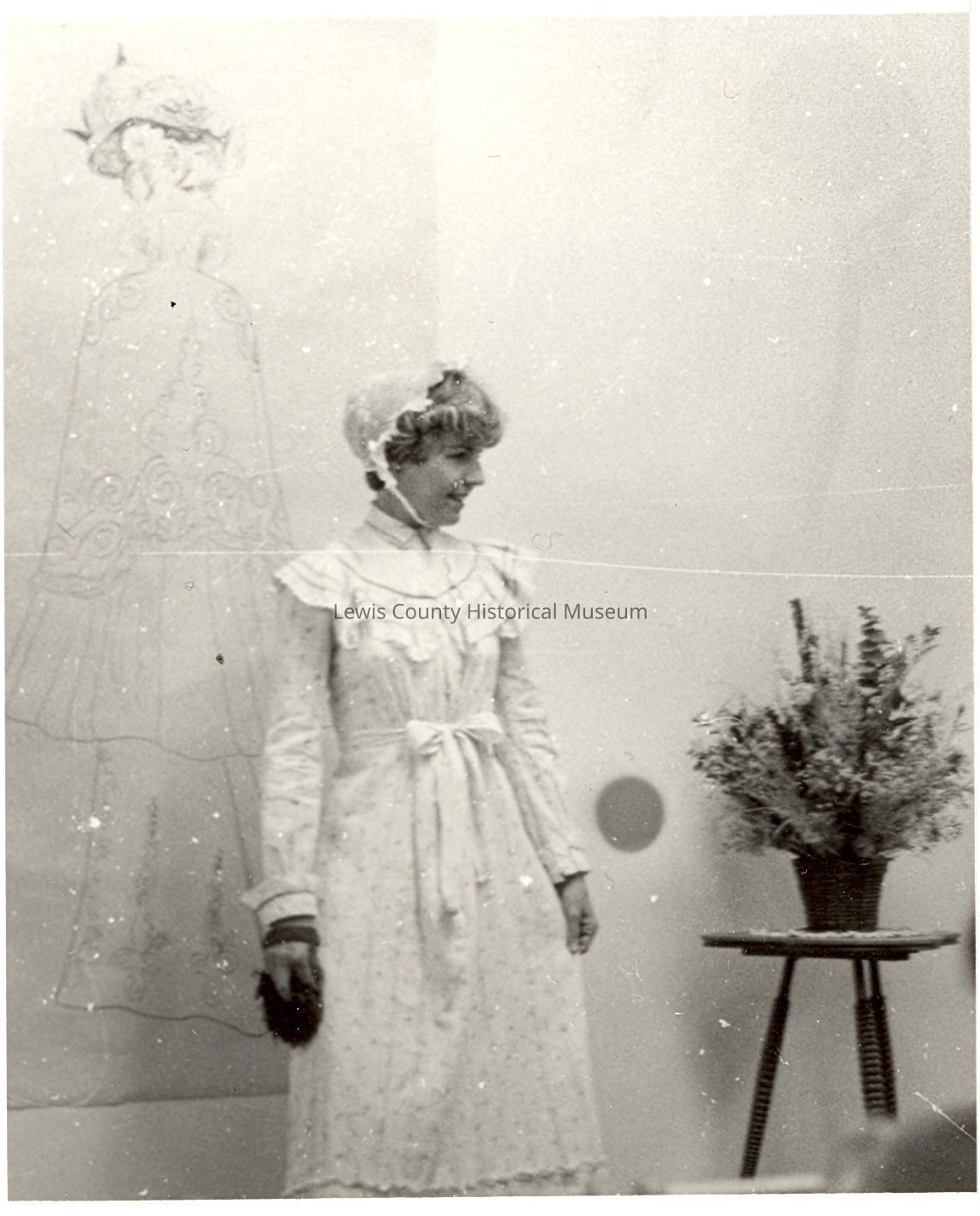 Donna Morrison in a print 1890's maternity dress and bonnet, "Fashion Thru The Ages" Lewis County Mall, July 1977.Lexicon