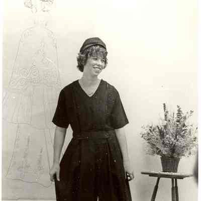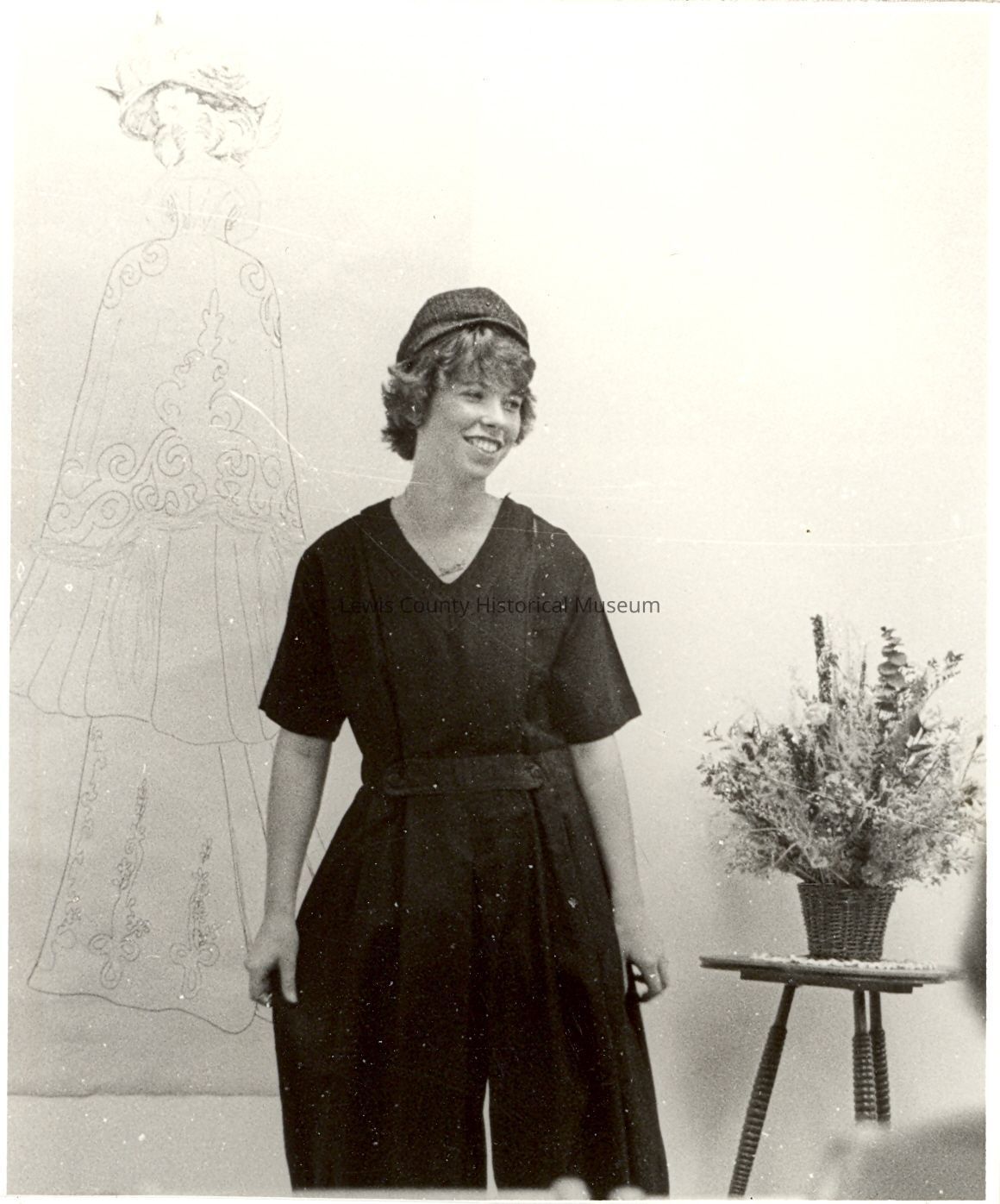 Monica Wrzensiski in a 1920's black gym-sports outfit and cap. Great sports fashion photo. "Fashion Thru The Ages", Lewis County Mall, July 1977.Lexicon