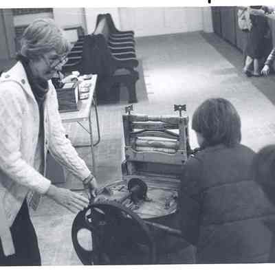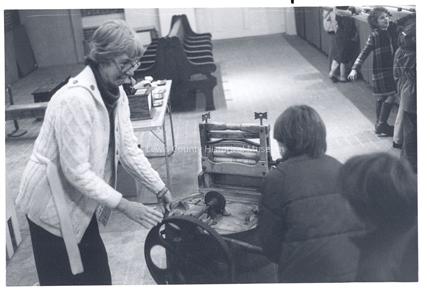 Mary Jane Sheridan with 3rd grade class demonstrating a 1902 wooden washing machine at LCHM, December 1979. Have negative.Lexicon