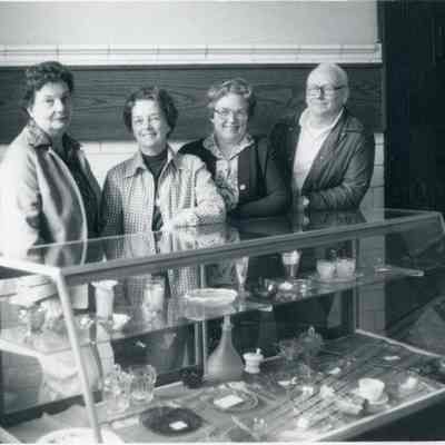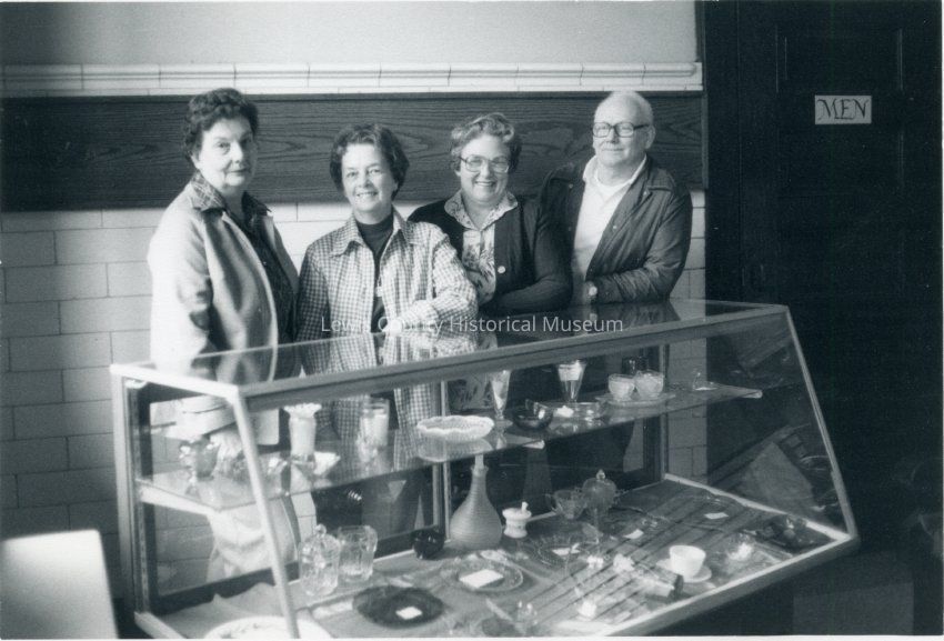 Lewis County Glass and Collectables club members and glass display case at the LCHM, Dec.1979. Identified L to R: Thelma McLarty, Helen Knoechel, Pat Rexroad, and Charlie Rexroad Club President.Lexicon