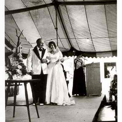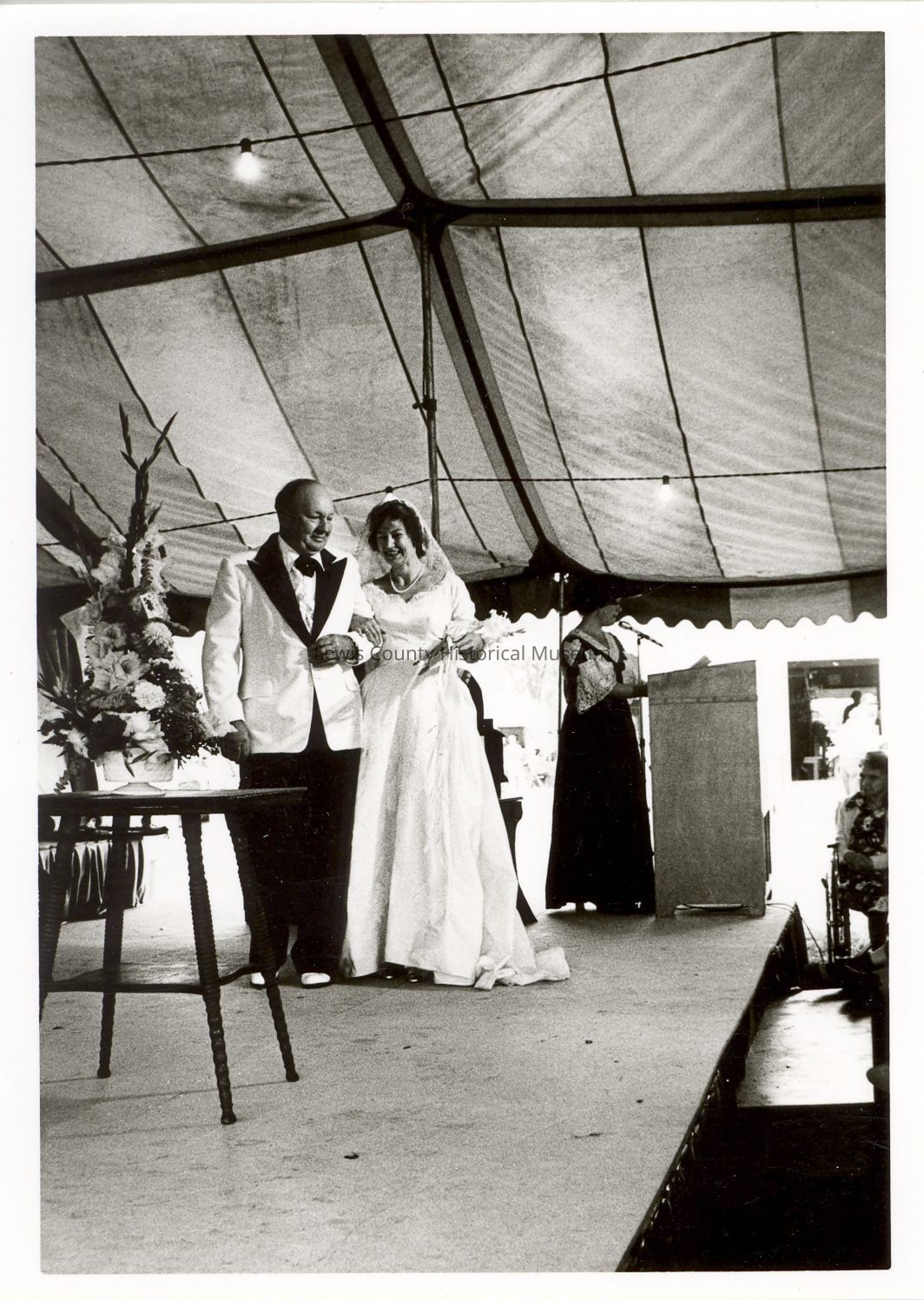 1980 Fashion Thru The Ages style show models Karl Blechschmidt and Sharon Hagstrom wearing 1960's tux and wedding dress. Taken at the SWW Fairgrounds free stage. Have negative.Collection
