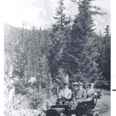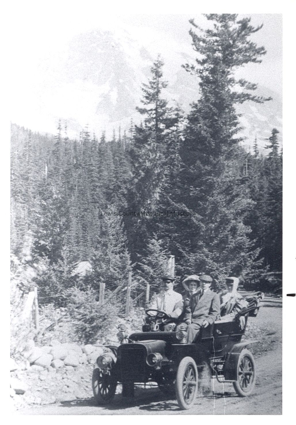 Longmeir Springs on the way to Mt. Rainier about 1908. Stearns first car (Cadillac), Driver Joel Sterns, next Frank Lee Lipscomb, back, Gertrude (L) Lipscomb and Emma Sterns. Photo shows the car, trees and in the distance Mt. Rainier. Have negative.Collection
