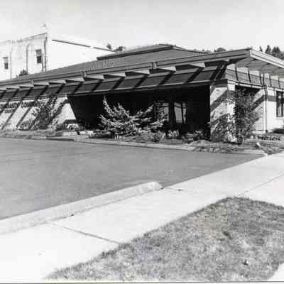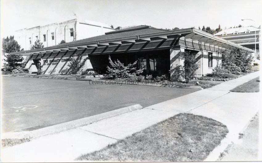 Title Guaranty Co. of Lewis County at 200 NW Pacific and Center Sts., Chehalis, WA. Right background is the Post Office and on left back is the I.O.O.F. Hall. Photo 1985.Collection