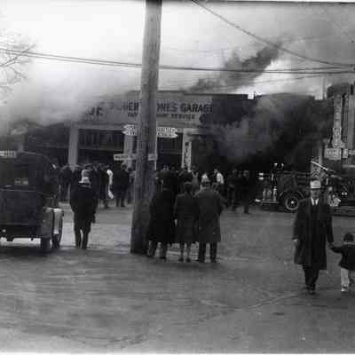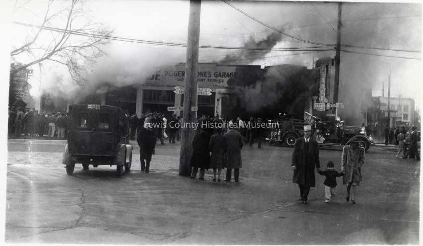 Digger Boones Garage burning - 1940. Corner of Market and Park Streets, Chehalis, WA.Collection