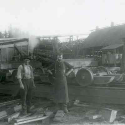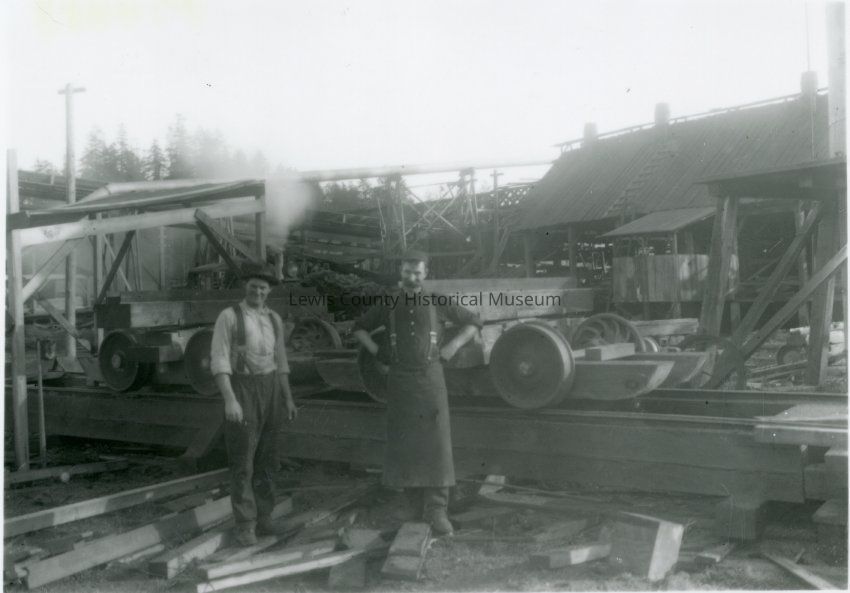 Somerville Mill near Napavine, WA. No ID on men. Rail sididing holds 2 flat cars for hauling logs, lumber etc. on mill site. Photo 1910. Have glass negative.Collection