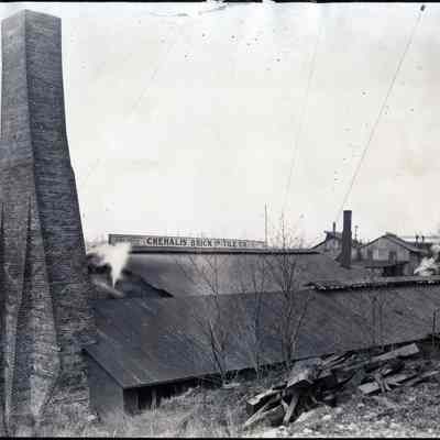 Excellent view of one of the large kiln chimneys at the Chehalis Brick and Tile Company on National Avenue, taken about 1920's. P941 is 1980's view of the same location. Good view showing the factory building and the sign. Part of this property later became the Owens Mill, later Hemphill-O'Neil Woodproducts were located in the right background.Collection
