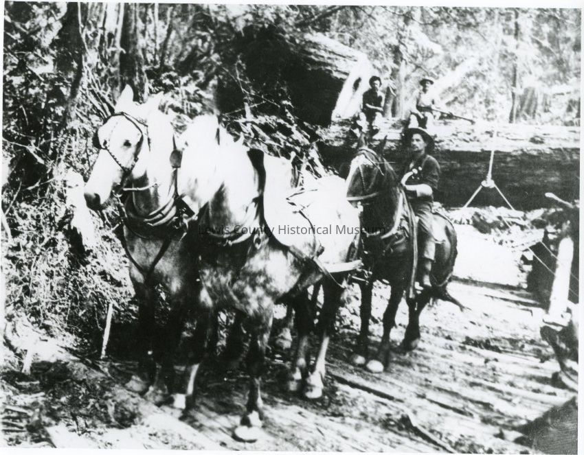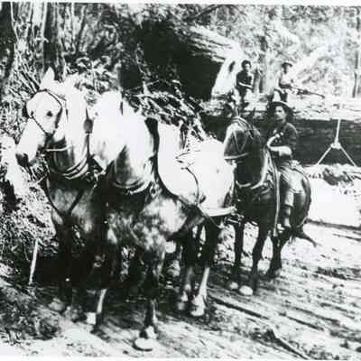Photo showing a team of horses logging on a skid road. ca. late 1800's Have negative.Collection
