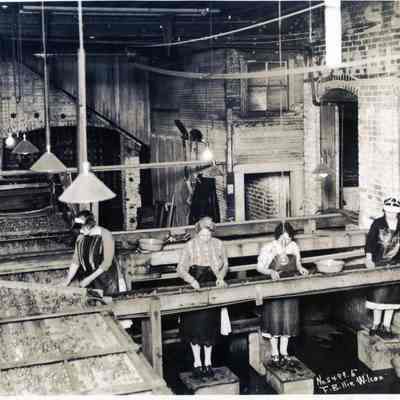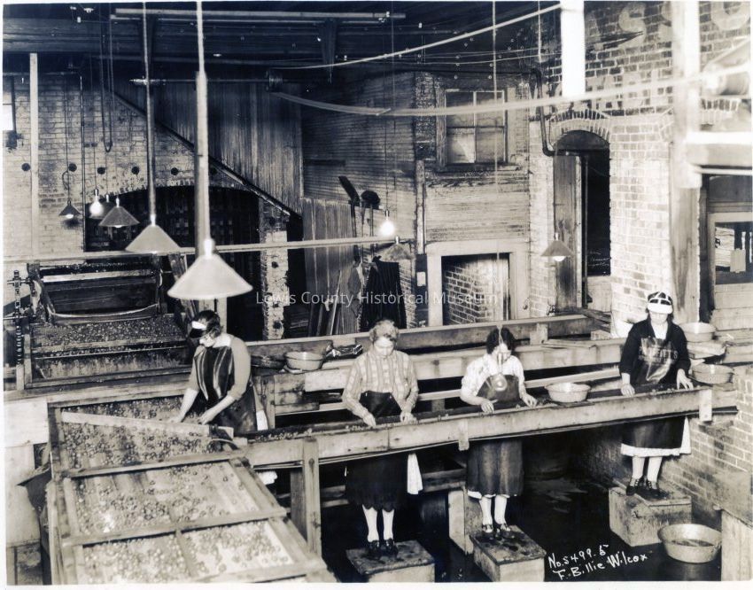 Strawberry processors sorting berries on the conveyor belt at Chehalis Cannery. Chamber of Commerce photo, 1932.