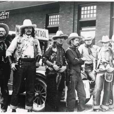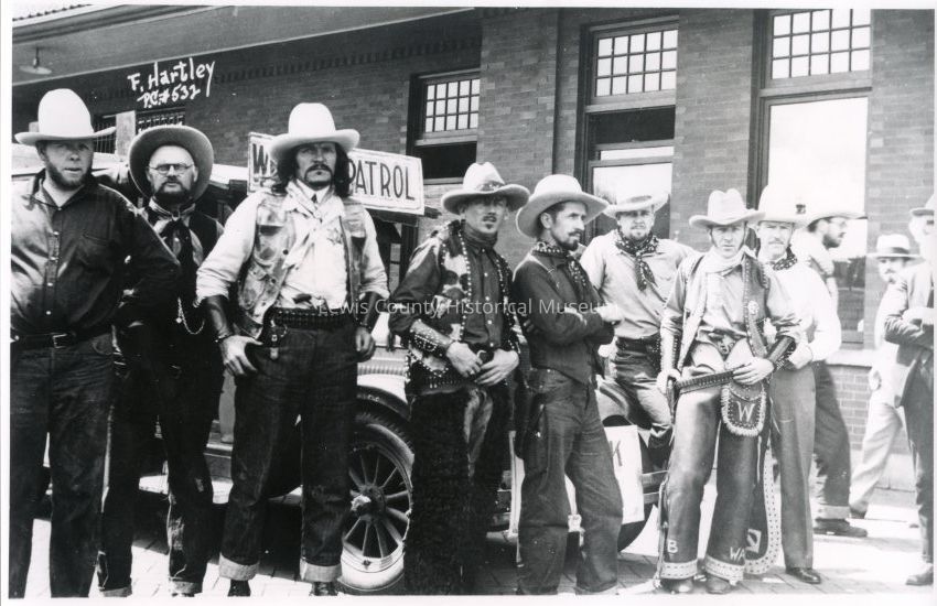 Group of men dressed in costume for the Centralia Pioneer Days Celebration, ca. 1933. These men, the officers, picked up men without whiskers and fined them or put them in the stockade. Have negative.Collection